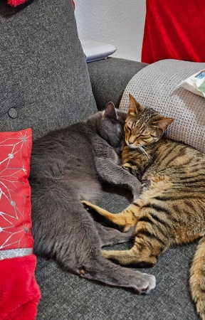 Ivartalan kandúr cicák, 4,5 és 5,5 évesek. A cirmos kicsit fél eleinte, aztán nagyon bújóssá válik, szürke cica nagyon nyugodt természetű, kedves cicák.