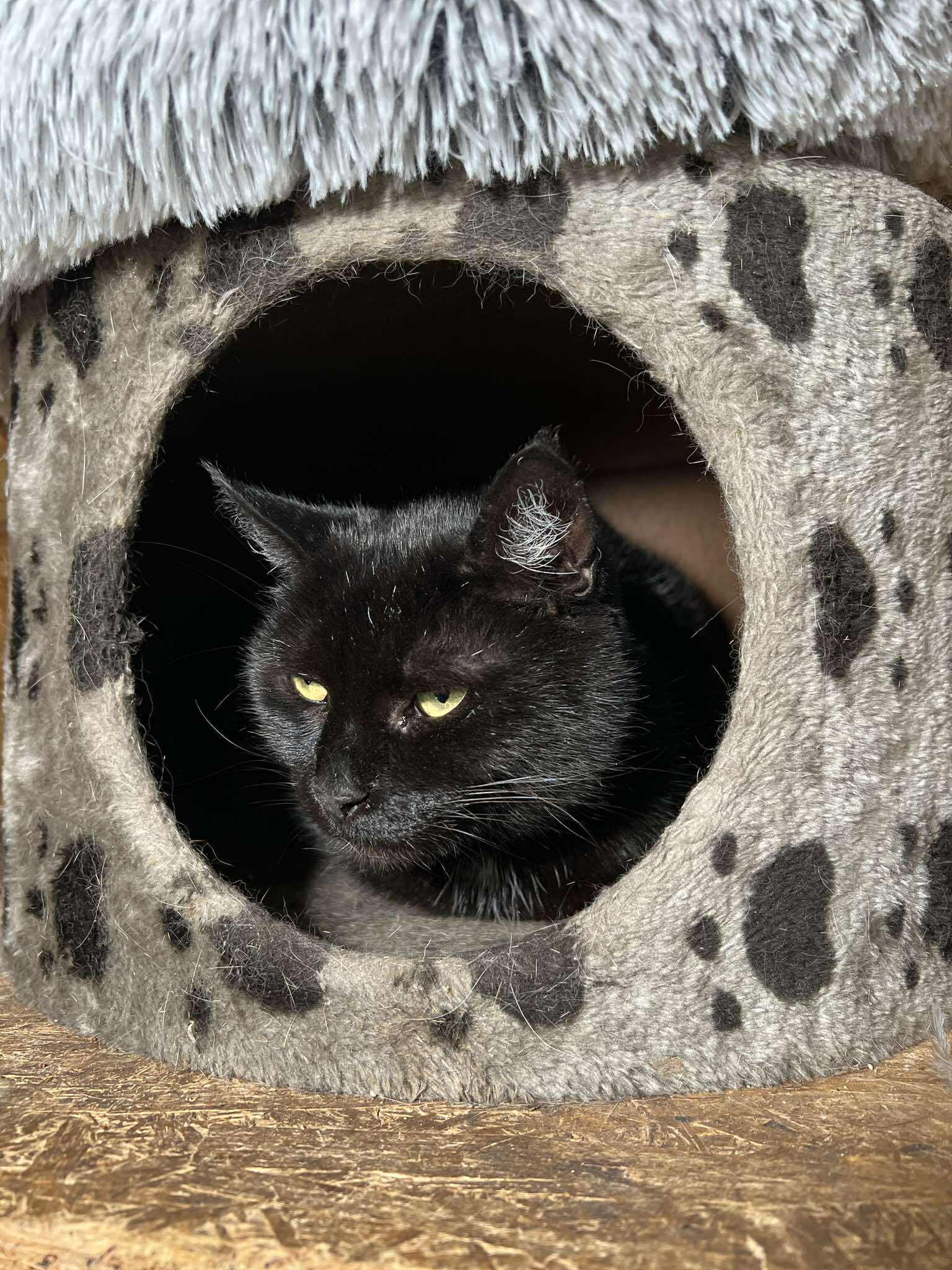 Szép nagy cica, busa fejjel, amolyan "kandúros" benyomást kelt, pedig kishölgyről van szó. Bár fekete, de mégis különleges, mert tele van fehér szőrszálakkal és aprócska fehér foltokkal, mint akire hipó fröccsent.