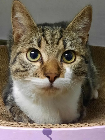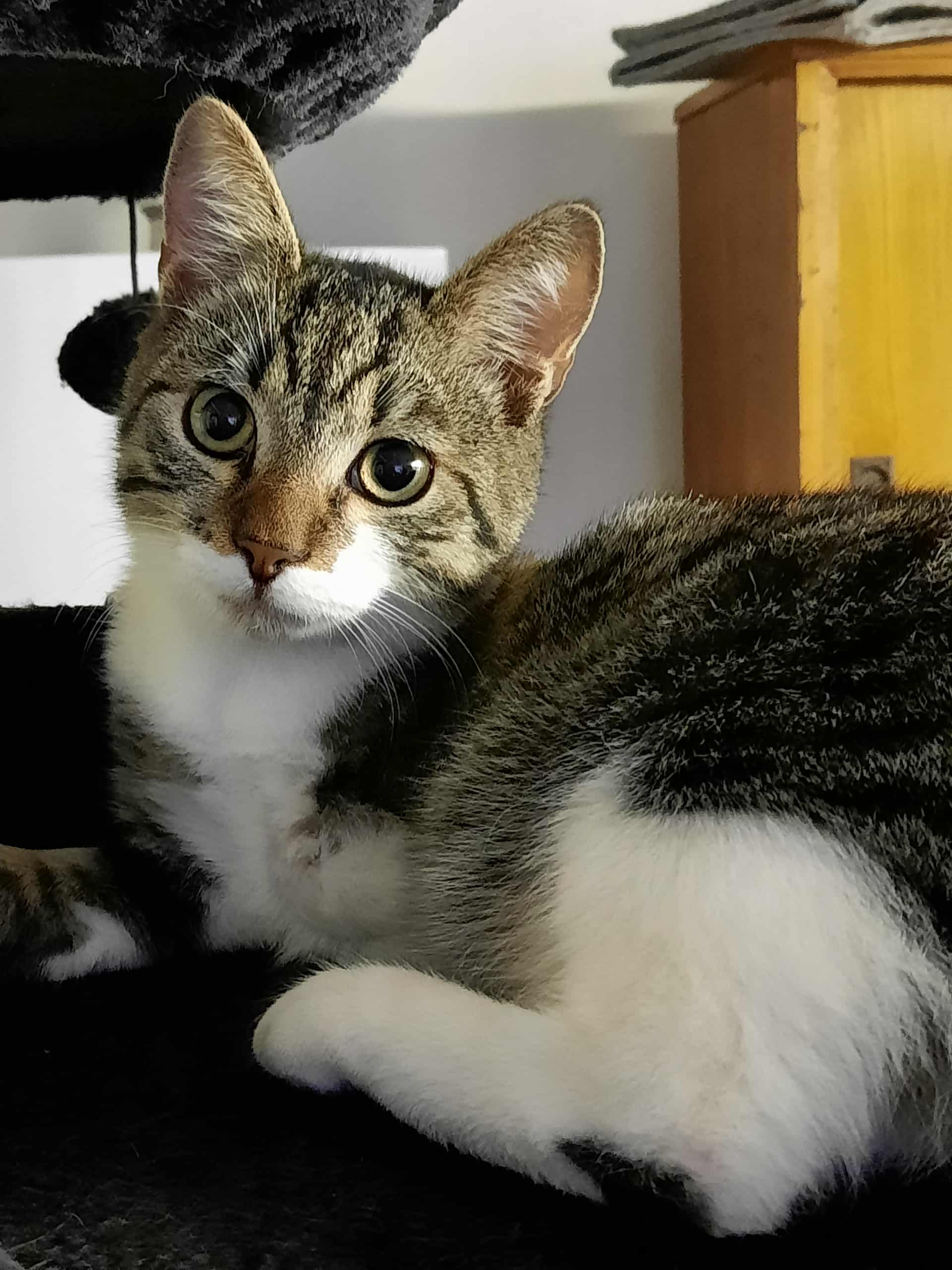 Szegénynek nehéz indulása volt: súlyos sérülés után mindent megtettünk, hogy megmentsük a lábát, de végül amputálni kellett az egyik mellsőt. Ez azonban cseppet sem tartja vissza — három lábon is vidáman, teljes életet él, fut, játszik és dorombol, mintha mi sem történt volna.