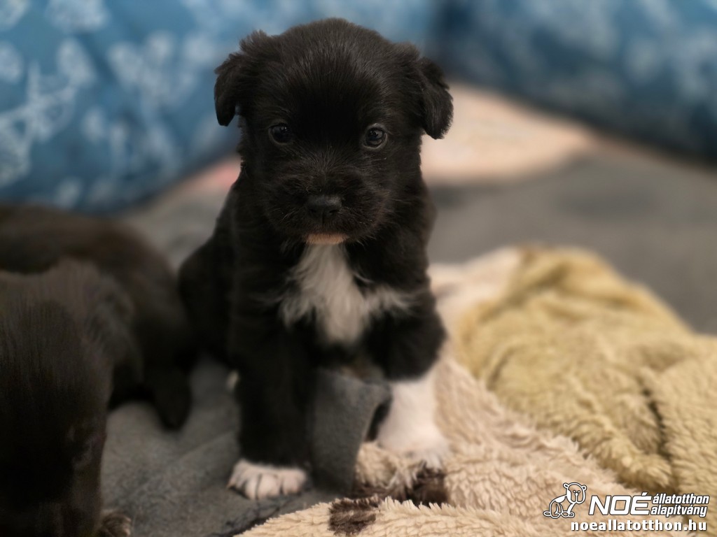 Keverék, várhatóan közepes testű lesz. Már most nagyon önálló, az első volt aki felfedező útra indult a tesók közül.