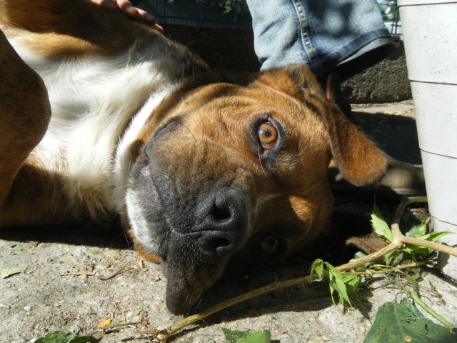 Rota másfél éves roti-kopó keverék szuka, akit Monával együtt mentettünk, szintén azonnal ivartalaníttattuk, mivel ő is vemhes volt. Jelenleg Okanzóval osztozik egy kennelen, alázatos, kedves, bújós kislány.