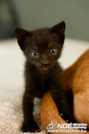 Az arcocskája több helyen el van törve, valószínűleg fejbe rúghatták. Az extra széles orrhát pedig Down szindrómára enged következtetni ( macskáknál ugyanaz a Down szindróma nem alakulhat ki ami az embereknél, csak valami hasonló ). Hogy lesznek-e egyéb tünetek, az majd kiderül, ebben a korban minden cica csetlik botlik, összevissza állnak a lábai és hetente változnak a testarányai, szóval majd meglátjuk. Én is futottam egy kört vele a Szupervetben, kapott gyógyszereket itthonra is. Annyira pici, hogy műteni nem igazán lehet, megvárjuk míg összeforr. Nagyjából 5 hetes lehet, így lassan már ehetne szilárd táplálékot, de törései miatt ez egyelőre szóba sem jöhet. Fecsiből eszik, illetve kistálból próbálkozik, a tejpótló+baby starter konzerv majszolásával.Az almot egész ügyesen használja.
