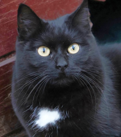 Különlegesen kedves arcú, meglepett tekintetű cica. Bár felnőtt cica, egész apró termetű maradt. Fekete bundáját fehér mellényke díszíti.
