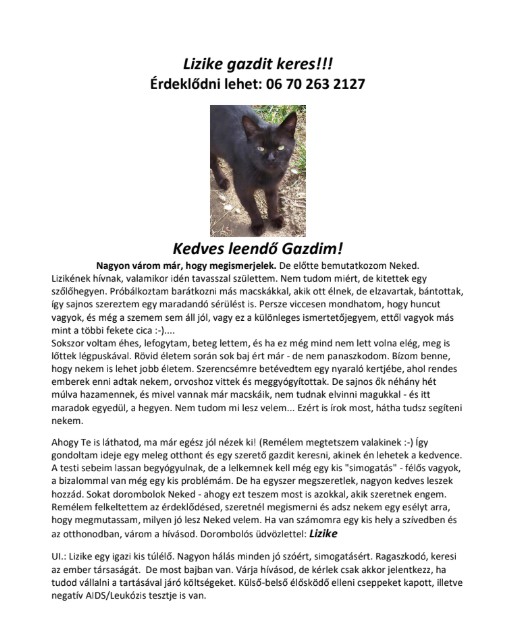 Lizikének hívnak, valamikor idén tavasszal születtem. Nem tudom miért, de kitettek egy szőlőhegyen. Próbálkoztam barátkozni más macskákkal, akik ott élnek, de elzavartak, bántottak, így sajnos szereztem egy maradandó sérülést is. Persze viccesen mondhatom, hogy huncut vagyok, és még a szemem sem áll jól, vagy ez a különleges ismertetőjegyem, ettől vagyok más mint a többi fekete cica :-)....