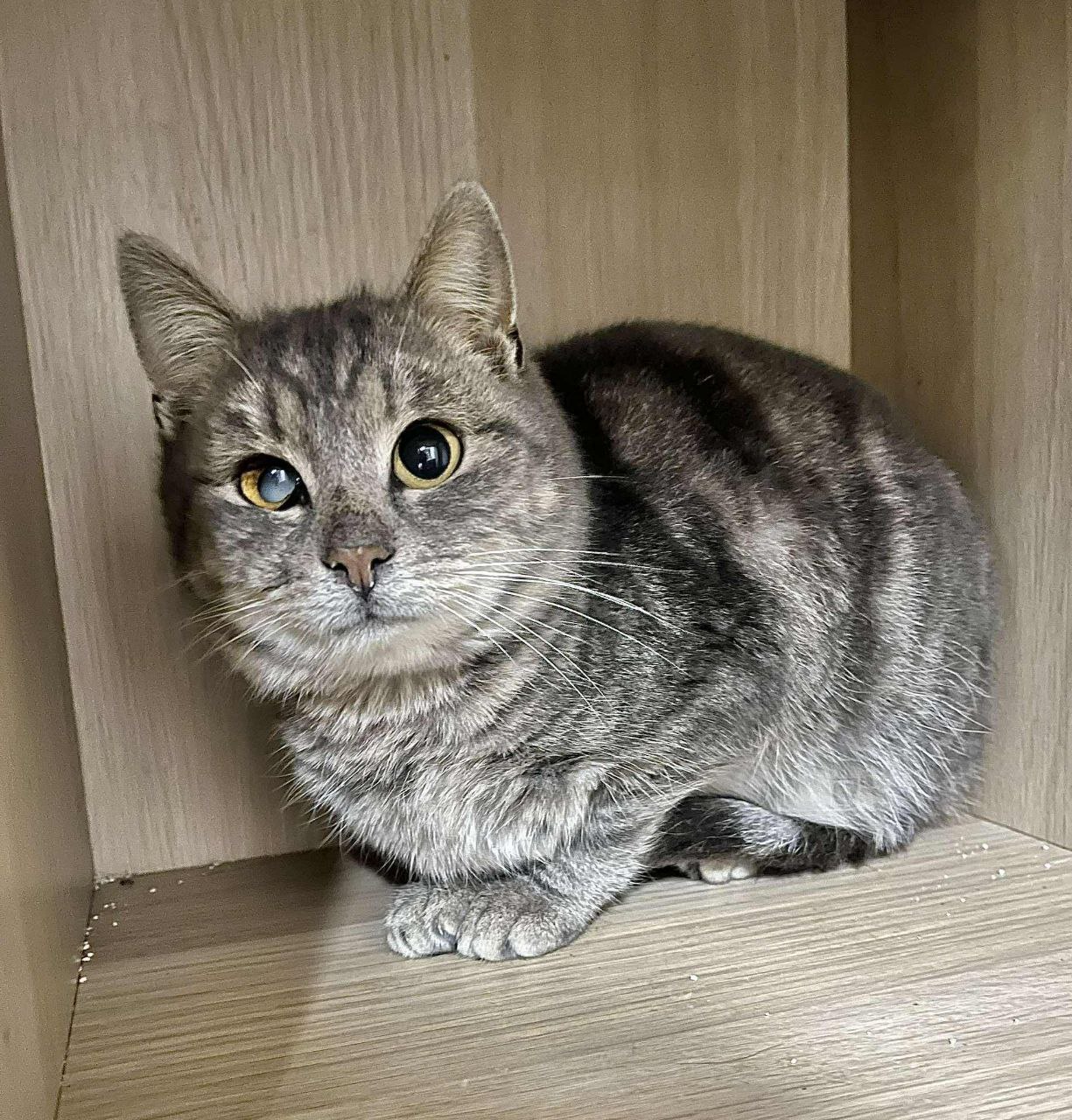 Maga is elég bogyószerű: apró, gömbölyű, kedves teremtés egészen különleges, hamvas márványos mintával. Az egyik szemén van egy homályos folt, de ez a cicát nem befolyásolja semmiben, kezelést nem igényel.