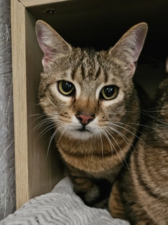 Csendes, alacsonyabb energiaszintű cicánk, akit közeli kapocs fűz barátjához, Jagermisterhez, akivel nagyon szeretnének együtt gazdisodni.