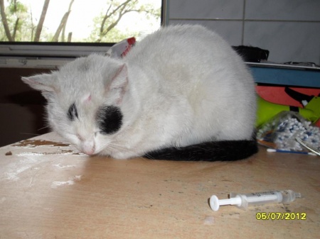 Ovi továbbra is nagyon aranyos cica, úgy látom, hogy egész jól van, kicsit szebb már a szőre és talán egy picit nyugodtabb is, és a járása is javult. Ma történelmi pillanatként egy picit dorombolni is hallottam :) Kapja az immunerősítőt továbbra is, és minden nap befújjuk a lábát, amit még mindig utál (ezt hangos fújással jelzi), de kezd egy kicsit hamarabb megbocsátani utána (ma pl. fél óra múlva már hajlandó is volt előjönni az ágy alól :))
