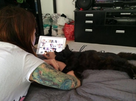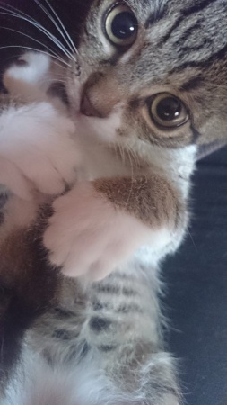 Több hónap folyamatos próbálkozás után – sokat beszéltünk hozzá, próbálkoztunk a kontakttal – nagyon lassan felengedett. Kb. négy hónap kitartó munka után megengedte, hogy megsimogassam J. Ez volt a fordulópont J. Azóta már a kanapéra feljön hozzám simire, a többi cicával együtt eszik, játszik, jól kijönnek egymással, összebújva alszanak J. Szépen eszik, mindenevő, lopkodós fajta, semmilyen elöl hagyott élelem nincs tőle biztonságban J.