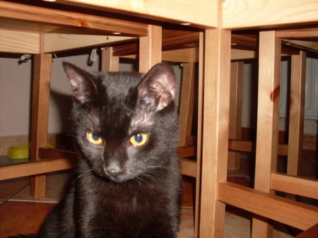 Grincs cica. Nagyon jól érzi magát, a kezdeti zavartság után már beilleszkedett, folyton bújik és dumál.